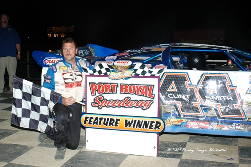 Clint Smith brought his recent World of Outlaws Late Model Series struggles to a resounding end as the ‘Great Northern Tour’ opened on Tuesday night. With one of the most dominant performances on the tour this season, Smith cruised out front from flag-to-flag to record his first victory of 2008 in the 40-lap A-Main at Port Royal Speedway. “The car was back good again,” a relieved Smith said after steering his J.P. Drilling/Cliburn Tank Lines GRT mount to a slump-busting triumph worth $7,150. “It was just idling around great. Tonight it wouldn’t do anything wrong.” Smith, 43, of Senoia, Ga., started from the pole position and led the entire distance, but seizing that top spot on the first lap was anything but easy. He was actually outgunned for the lead twice by fellow front-row starter Chub Frank of Bear Lake, Pa., but a caution and a red flag on the opening circuit negated Frank’s passes and allowed Smith to assume command for good when the third attempt to start the race was successful. No one was able to seriously challenge Smith, who built a full-straightaway victory margin over the Reliable Painting/Valvoline Rocket driven by defending WoO LMS champion Steve Francis of Ashland, Ky. Frank settled for a distant third-place finish in his Lester Buildings Rocket. Tim Fuller of Watertown, N.Y., improved two positions to finish fourth in the Gypsum Express Rocket – just his second top-five finish of the season – and Darrell Lanigan of Union, Ky., started and finished fifth in the GottaRace.com Rocket to run his WoO LMS consecutive top-five streak to five races. Smith credited his Hoosier tire selection with propelling him to his 11th career WoO LMS triumph. “I was on the right rubber,” said Smith, whose last WoO LMS win was on Sept. 15, 2007, at I-55 Raceway in Pevely, Mo. “Chub beat me the first couple (attempted) starts because he was softer on rubber, so I wasn’t panicking. I figured my car was plenty good and we were gonna pass him back if the race stayed green. “On that third start, I finally got some heat in the tires. I didn’t spin the tires when I got to the flagman, so I stayed alongside Chub into the corner and I pulled him off (turn) two.” Smith simply perched his car on the strip of rubber that formed along the inside of the half-mile oval and pulled away from the field. “We’re usually good in this type of (surface) condition,” said Smith, who finished fifth in last year’s WoO LMS inaugural at Port Royal Speedway. “I could run as fast as I wanted to ride. I just ran three-quarter throttle most of the time. I wasn’t hardly using the brakes in the corner, I was just rolling right through there. “I just had to watch that lapped traffic, which was treacherous.” Indeed, Smith’s scariest moment came on lap 35 as he was lapping WoO LMS Rookie of the Year contender Danny Johnson of Phelps, N.Y. Contact between the two cars on the backstretch peeled up the left-front corner of Smith’s hood. “The ‘Doctor’ (Johnson) was just hugging the bottom so I went to the outside, and then he went straight to the wall,” recalled Smith. “I slammed the brakes on and he hit me. It almost got ugly for both of us, but I know he didn’t hit me intentionally. The World of Outlaws don’t use the move-the flag, so he didn’t know I was there.” The victory moved Smith to seventh in the WoO LMS points standings. He overtook Shane Clanton of Locust Grove, Ga., who salvaged a 10th-place finish despite using a provisional to start the A-Main (he was knocked from the lead in his heat by a broken stud-bolt on his car’s water pump) and pitting on the opening lap of the feature to change a right-front tie-rod that was bent in a scrape with Jere Wierman of Stewartstown, Pa. “We needed to get a win,” said Smith, whose only previous victory this season came in a UMP DIRTcar-sanctioned event on Feb. 15 at Volusia Speedway Park in Barberville, Fla. “We’ve been struggling a little bit, so I know I need a good road trip if I have any hope of getting back in the points race. This is a good start I guess.” Francis, 40, grabbed sole possession of the WoO LMS points lead with his runner-up finish. He entered the night tied for the top spot with Lanigan. “We had a good car, but it wasn’t as good as Cat’s car (Smith),” said Francis, who surged forward from the fourth starting spot to take second from Frank on lap two. “We were just a little bit off and finished second.” Frank, 46, wondered what might have been if his intial-start passes of Smith hadn’t been erased, but he still wasn’t satisfied with his car’s performance. “Maybe if I got ahead of him I could’ve gotten into a rhythm and held him off,” said Frank. “But for some reason I couldn’t steer my car for like eight or 10 laps, so it probably would’ve been tough to stay up there.” A total of three caution flags and one red flag slowed the A-Main. Clanton brought out the first caution when he stopped on the opening lap. Subsequent cautions flew on lap four for Rick Eckert of York, Pa., who slowed and then pitted for quick service, and on lap 25 for Kirk Ryan of Lewisberry, Pa., whose strong run ended with mechanical trouble as he ran in sixth. The red flag was needed for a multi-car tangle between turns one and two on the race’s second attempted start. Lanigan and Shannon Babb of Moweaqua, Ill., got together near the front of the field, setting off a scramble that involved Eckert, among others, and left the car of Selinsgrove, Pa.’s Jim Yoder balanced on the side of the Sweeteners Plus machine driven by WoO LMS Rookie of the Year contender Vic Coffey of Leicester, N.Y. Both Josh Richards of Shinnston, W.Va., and Jeremy Miller of Gettysburg, Pa., lost potential top-10 finishes to flat tires. Richards was running sixth when his car’s deflated right-rear tire forced him to pit during the lap-25 caution period (he rallied to finish 13th), while Miller tumbled fro